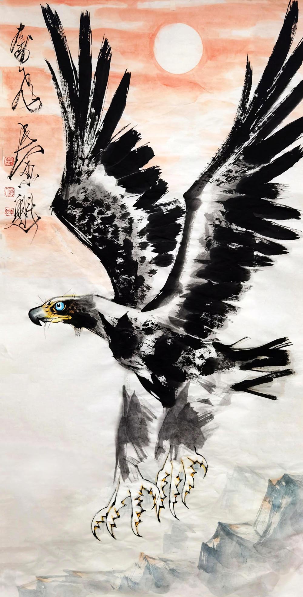 国画大家吴东魁的花鸟画素享盛誉,多年的探索推敲,已经形成了自己的表现手法。今日得见吴东魁的画鹰栩栩如生,英气逼人,画得最活泼的是鹰的眼睛,他把鹰眼化方为圆,眼球突出犀利,突显鹰的锐猛,弥漫着一种逼人的威武之气。嘴像利斧,气势威猛,严酷凶悍。翅膀上的羽毛用厚重和略浅的墨块来交替表现,颈部一样用淡墨画成,爪用重墨勾更好地写出了鹰的精神,既苍润松秀,又极富质感。